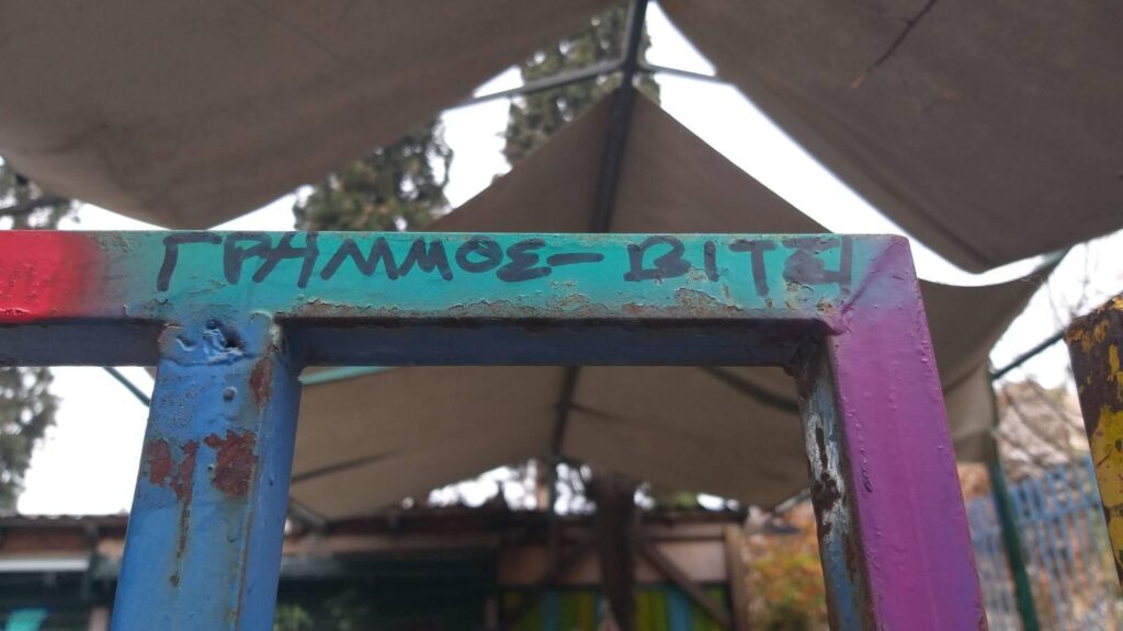 Οι ΜΑΤατζήδες στο μεταξύ, εκτός από το μουτζούρωμα, δουλεύουν και το μαρκαδοράκι, γράφοντας σχεδόν αόρατα συμβολάκια και συνθηματάκια στην καγκελόπορτα του Εξωστρεφή, όταν δεν την κατουράνε. Θα προσπεράσουμε τα ναζιστικά σύμβολα, τα έχουμε ξαναδεί, αλλά και να μην τα βλέπαμε, ξέρουμε τι ναζίδια είναι. Θα μείνουμε στο “ΓΡΑΜΜΟΣ – ΒΙΤΣΙ”. Τιμή μας που μας ταυτίζουν με τον Δημοκρατικό Στρατό. Μόνο που βρίσκονται στον Λόφο Στρέφη, με 150 μέτρα υψόμετρο. Και για να ανεβούν στον Γράμμο, για να κάνουν τις εμφυλιοπολεμικές τους γιορτές κάθε 29 Αυγούστου, είναι εντελώς ανίκανοι και τους ανοίγει παράνομα, δρόμο ο Δένδιας. Οπότε, ας τρέχουν προς το παρόν να κρυφτούν στις κλούβες τους με την πρώτη ψιχάλα, βάζοντας τις ασπίδες για ομπρέλα και ας ονειρευτούν εμφυλίους αγκαλιά με τα αρκουδάκια τους.